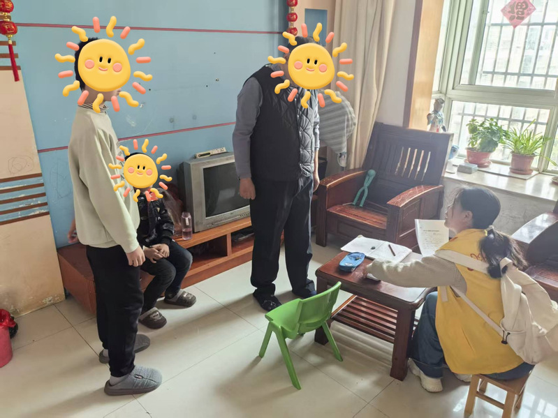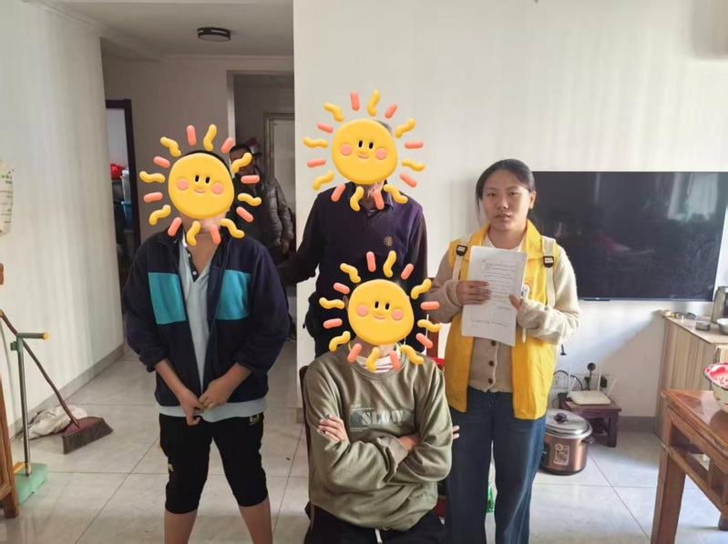 活动现场,志愿者们刚踏入家庭客厅,便与孩子们和家属自然熟络起来:一位身着黄色志愿马甲的同学手持记录表单,蹲在小桌旁,边倾听孩子分享日常,边细致记录其生活与学习近况;同行的志愿者们则与家属轻声交流,了解家庭的实际需求,客厅里窗上的福字、墙上“家和万事兴”的装饰,让这场交流更显温馨。现场的少年们也渐渐放松下来,有的并肩围坐分享趣事,有的参与到轻松的互动中,原本安静的空间渐渐漾开笑声。