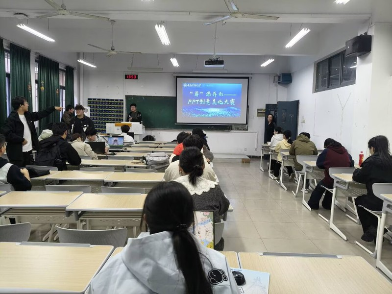 下午 14:30,比赛准时拉开帷幕。在规定的 60 分钟内,选手们迅速进入创作状态,现场瞬间陷入专注的氛围中,唯有键盘敲击的清脆声响交织回荡。大家充分发挥想象力与创造力,打破传统 PPT 模板的束缚,从视觉排版的逻辑构建到色彩搭配的和谐融合,从信息层级的清晰呈现到个性化元素的巧妙融入,每一个细节都凝聚着选手们的思考与匠心。有的作品简约大气、重点突出,尽显实用主义的设计巧思;有的作品色彩绚丽、创意十足,展现出独特的审美视角;还有的作品将文字、图片与特效完美结合,打造出沉浸式的视觉体验,充分展现了安职大学子扎实的设计功底与丰富的创意潜能。