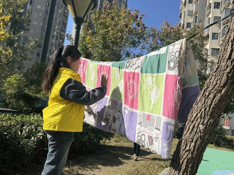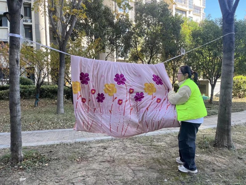 活动当天,活动当日,志愿者和社工队伍迅速集结。他们根据名单分组行动,挨家挨户上门收取被褥。在李爷爷家中,因腿疾多年不便下楼的他,看到志愿者们抱起被子,激动地连连道谢。整整一个上午,社区的空地上挂满了五颜六色的被子,形成了一道独特而温馨的风景线。志愿者们不仅帮忙晒被,还趁此机会与老人们拉家常,询问他们的身体状况和生活需求,叮嘱他们注意降温保暖。