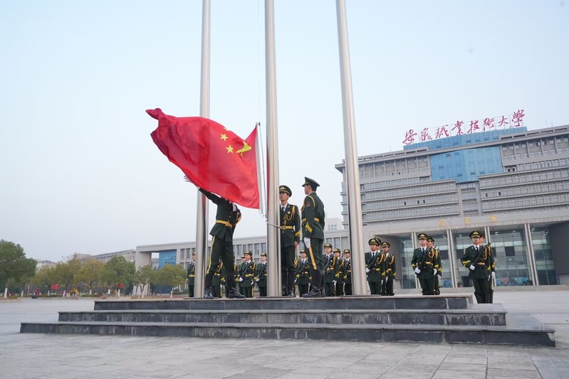 国旗飘扬砺壮志,青春聚力启新程。晨曦微露,风华广场庄严肃穆。国旗护卫队迈着铿锵有力的步伐,护卫五星红旗走向升旗台。伴随着雄壮的《义勇军进行曲》,鲜艳的国旗迎着朝阳冉冉升起。全体师生肃立注目,表达对祖国的无限热爱与对革命先烈的深切缅怀。