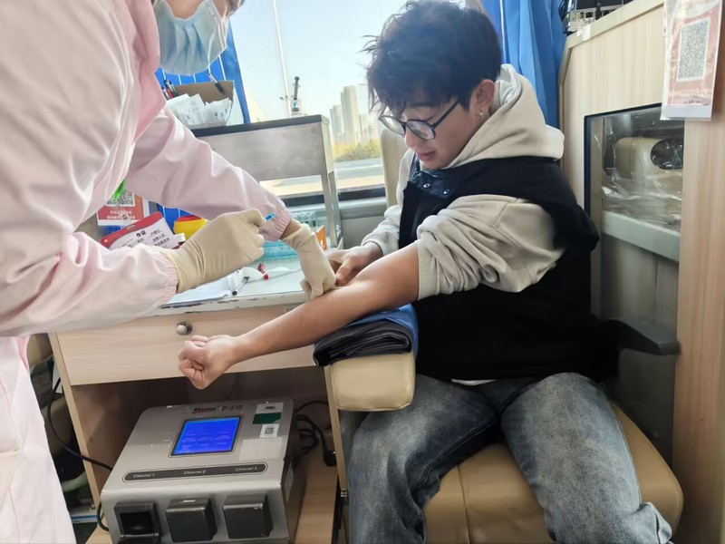 活动期间,志愿者们提前抵达现场开展筹备工作,以饱满的热情投入志愿服务,在爱心大巴旁耐心指导同学们规范填写献血登记表,确保信息准确无误。在爱心献血大巴上,护士为献血同学测量血压、检测血型,细致完成各项身体检查为献血后的同学递上糖水、营养品与纪念证书,轻声叮嘱术后护理要点,用贴心服务为爱心保驾护航。