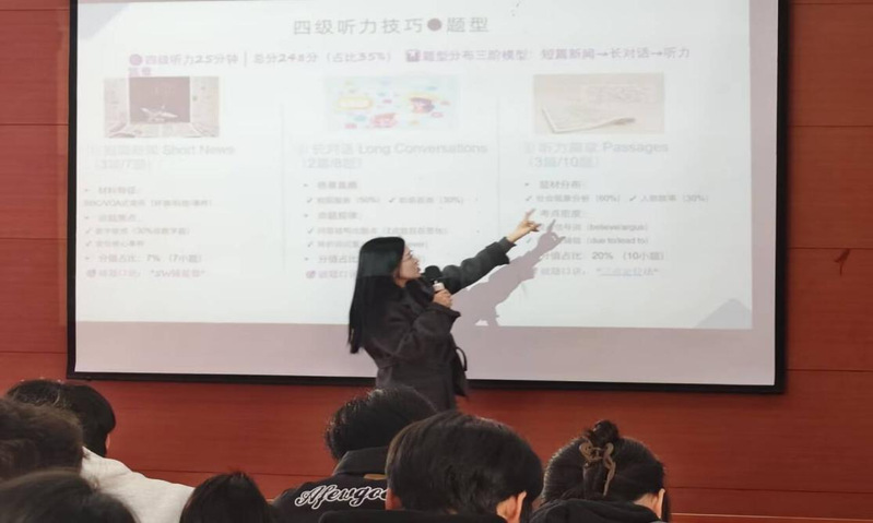 为精准对接学子大学英语四级备考的实际需求,助力学生厘清题型逻辑、掌握高效应试技巧,12月10日,由外语协会主办的“四级专题讲座第二期”在北园博学附楼2楼顺利举行。本次活动既旨在帮助学生夯实语言能力、提升应试信心,也践行外语协会“学以致用,用以促学”的宗旨,缓解备考压力,推动“备考技巧”与“语言应用”的双向融合。