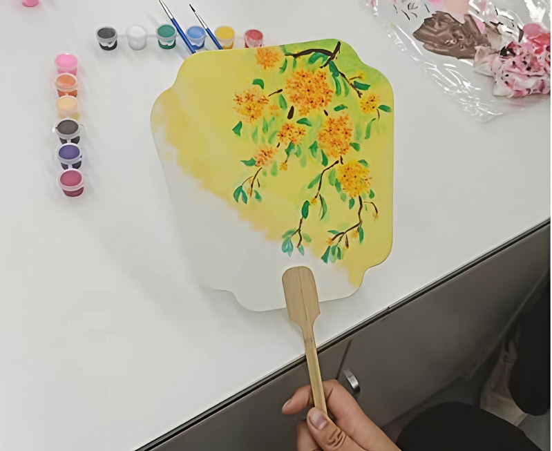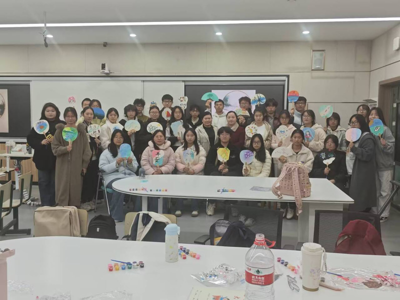 创作环节中,空白团扇、颜料与画笔依次排开,大家以英语交流创作思路:有人用暖色调晕染落日晚霞,有人以清雅笔触勾勒山水意境,还有人搭配英文短句传递“平安”“温暖”的美好祈愿。原本素净的团扇,在跨文化的创意碰撞里,成为兼具东方韵味与国际表达的独特作品。活动尾声,师生手持亲手绘制的团扇合影,每一把扇子既是文化信物,也是英语角里“用语言讲好中国故事”的生动实践。