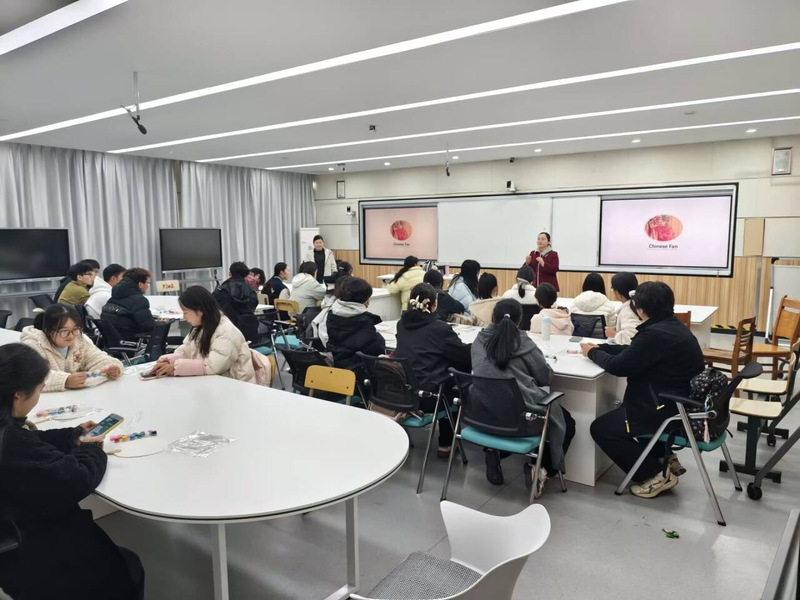 活动伊始,两位老师以英语介绍团扇的历史脉络:从先秦时期的实用器具,到唐宋成为承载诗词、书画的艺术载体,团扇不仅是“团圆友善”的文化符号,更是东方美学的缩影。现场同步展示的传统扇面作品,让参与者在双语解说中,直观触摸非遗文化的魅力。
