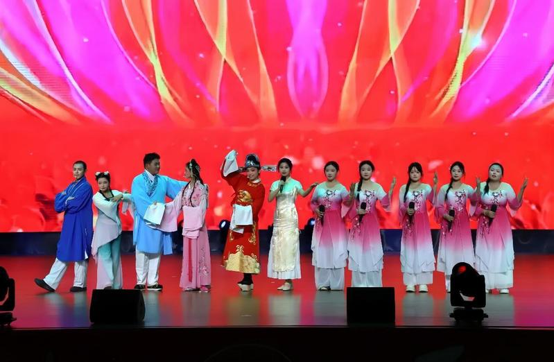 晚会中,由吴晓曼老师指导、群英曲艺社11名社员共同演出的黄梅戏串烧《徽风皖韵》成为亮点节目。该节目以《黄梅戏过新年》开场,营造出喜庆祥和的新年气氛;随后,《天仙配》《打猪草》等经典选段相继登场,社员唱腔醇正、表演生动,赢得现场热烈反响;《女驸马》选段通过深情而富有力度的独唱,塑造出坚韧鲜明的女性形象,将现场气氛推向高潮;最终,全体演员齐声合唱,节目在恢弘和谐的旋律中圆满结束。