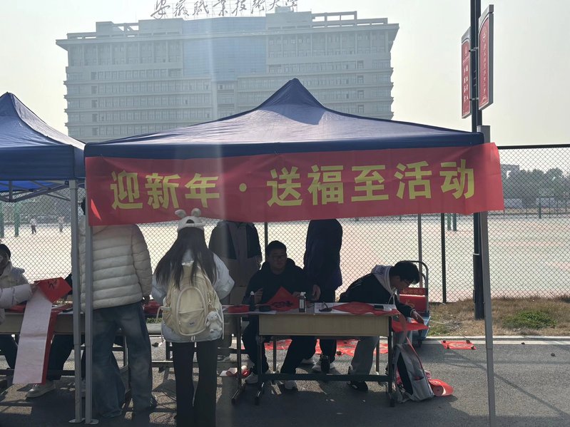 红纸翻飞传递新春喜悦,浓墨挥洒浸润文化馨香。2025年12月30日上午10时30分至13时30分,一场充满传统年味的“迎新年·送福至”挥墨送祝福活动在我校皖韵苑食堂门口热烈举行。活动吸引了全校众多师生踊跃参与,在寒冷的岁末为大家送上了真挚而温暖的新年祝福。