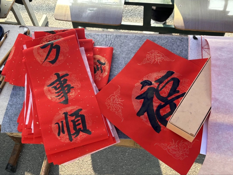 笔走龙蛇显风采,一横一竖寄深情。活动中,师生中的书画爱好者们化身“新年祝福官”,铺开喜庆的红纸,凝神聚气,挥毫泼墨。不一会儿,一副副苍劲有力、寓意吉祥的春联,一张张形态各异、饱满浑厚的“福”字便跃然纸上。领取到墨宝的同学们脸上洋溢着喜悦的笑容,他们手捧散发着清新墨香的春联和“福”字,纷纷感叹这不仅是一份新年礼物,更是一次与中华优秀传统文化的零距离对话,极大地增强了大家的民族自豪感与文化自信。