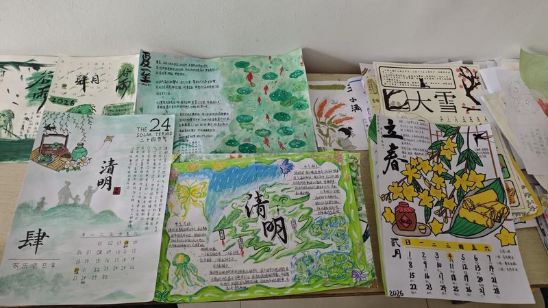 本次活动以“传承节气文化,绘制特色日历”为主题,参与者任选包含心仪节气的月份,创作A4尺寸手绘原创日历,作品需涵盖月份日期、节气名称、手绘插画和100-200字文字说明,展现节气特色与创意。同学们巧笔勾勒,将立春生机、霜降清寒等意象融入作品,文字说明兼具科普性与文化性,尽显对传统的理解与热爱。