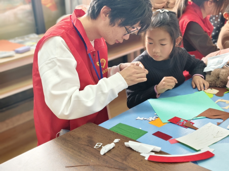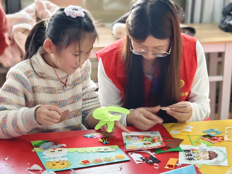 在趣味互动环节,志愿者与小朋友们携手开展雷锋主题粘贴画创作活动。大家分工协作、共同配色、细心拼接,在指尖的创作中重温雷锋故事,深化对雷锋精神的理解与感悟,活动现场欢声笑语不断,温情氛围萦绕全场。