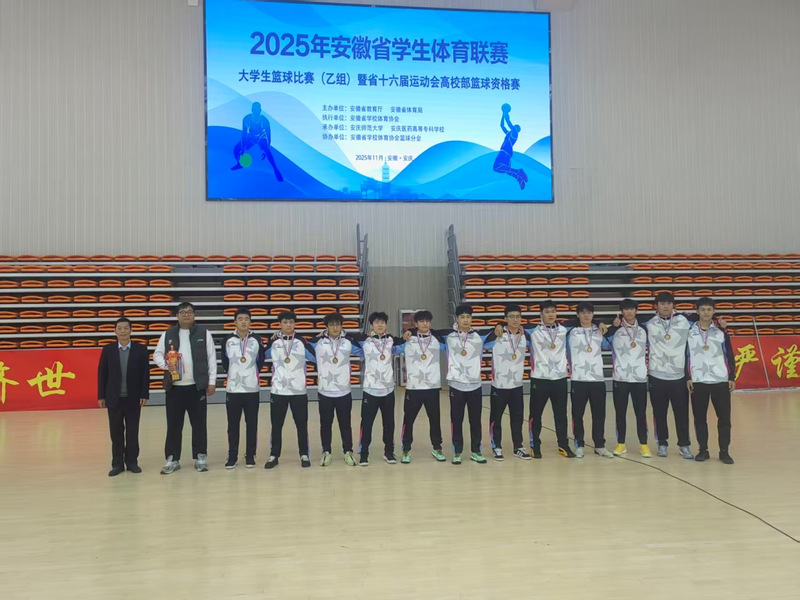 青春无畏展锋芒,团结拼搏夺佳绩。11月5日至13日,由安徽省教育厅、安徽省体育局联合主办的2025年安徽省学生体育联赛大学生篮球比赛(乙组)暨省十六届运动会高校部篮球资格赛在安庆火热开赛,我校男子篮球队奋勇争先、力克强敌,最终斩获季军,并成功拿到省十六届运动会高校部篮球比赛入场券。