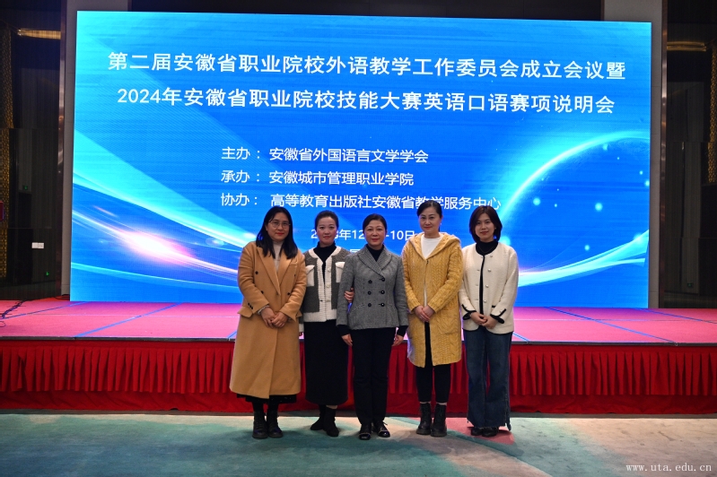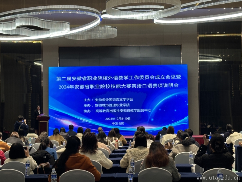 12月9日,第二届安徽省职业院校外语教学工作委员会成立会议暨2024年安徽省职业院校技能大赛英语口语赛项说明会在合肥召开。外国语学院副院长胡菁蕾、英语教研室副主任赵荃和部分教师应邀参加了此次会议。
