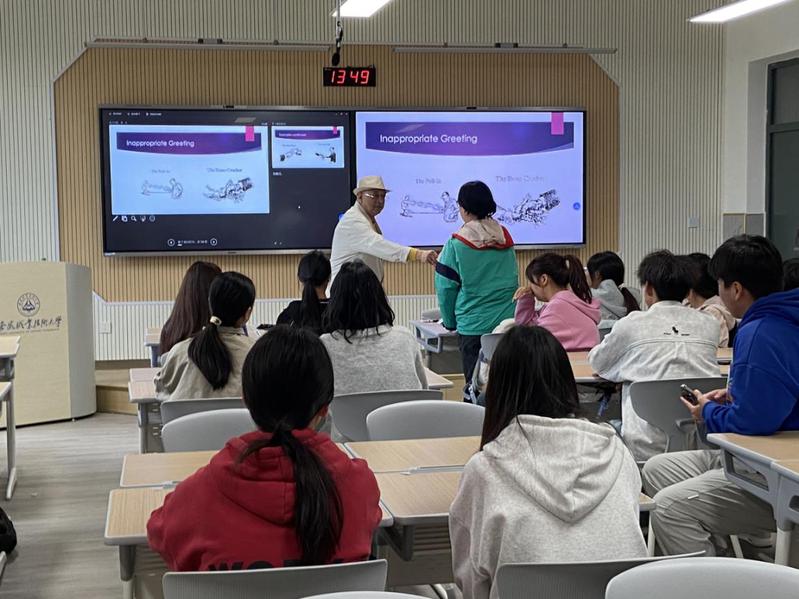 为进一步提升学生的跨文化交际能力与职业素养,外国语学院于10月29日在笃行楼103教室成功举办了以“商务礼仪”为主题的英语角活动。本次活动由外教Wallace教授和外国语学院教师张亚婷主讲,通过“理论精讲+现场实操”的模式,围绕商务形象塑造展开了一系列生动实用的分享与互动。