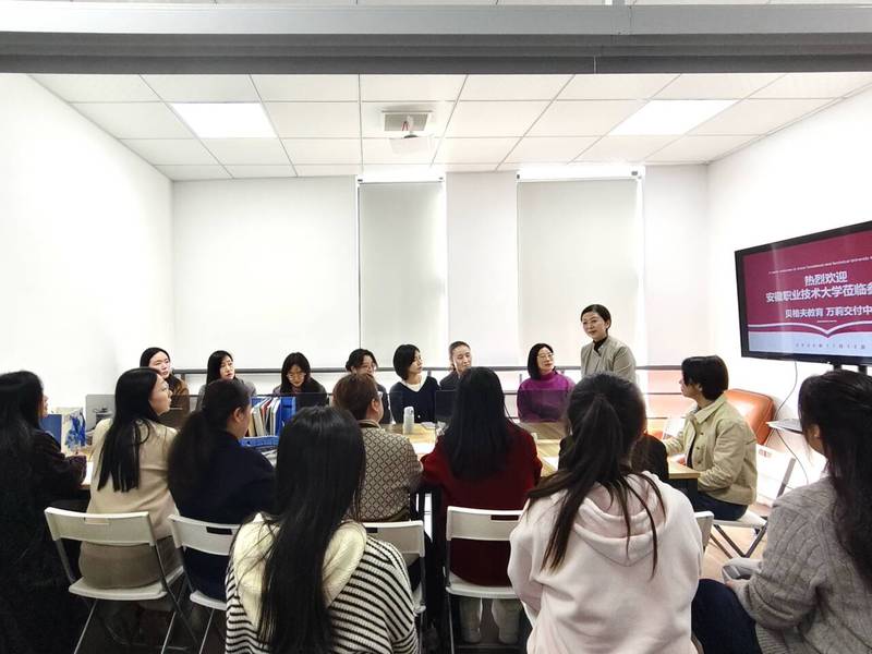 在合肥贝格夫教育科技有限公司万莉校长陪同下,外院教师参观了工作培训教室,汪志华老师向老师们详细介绍了公司的培训管理制度、培训课程实施、学生工作情况等信息。