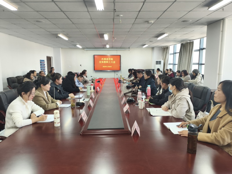 11月26日,外国语学院在图文信息中心十三楼会议室召开全体教职工大会。会议由外国语学院党总支书记何晓皖主持,外国语学院全体教职工参加了会议。