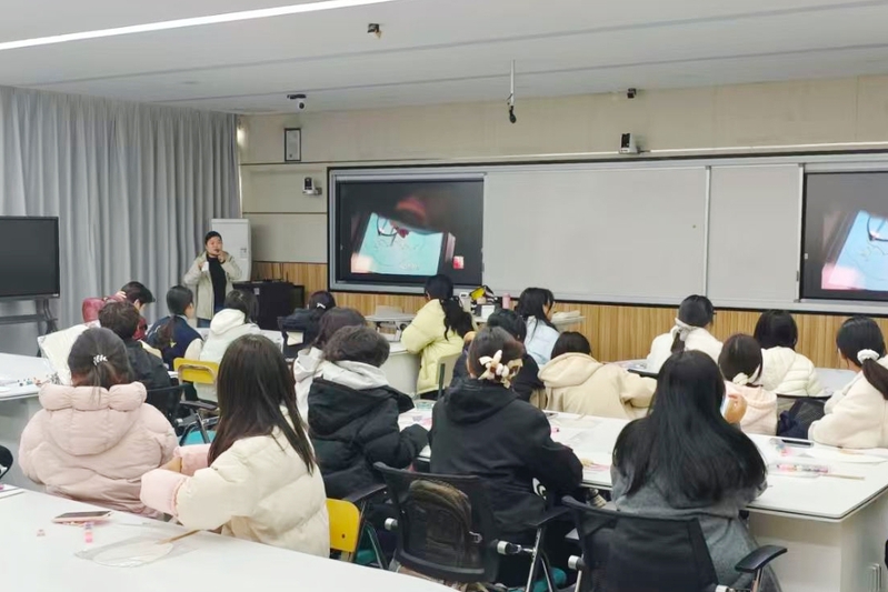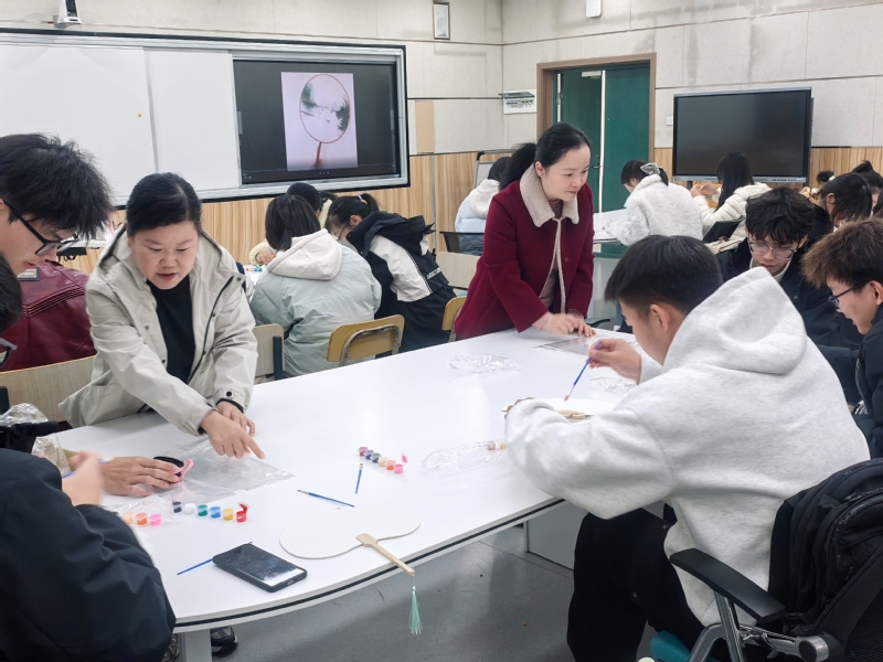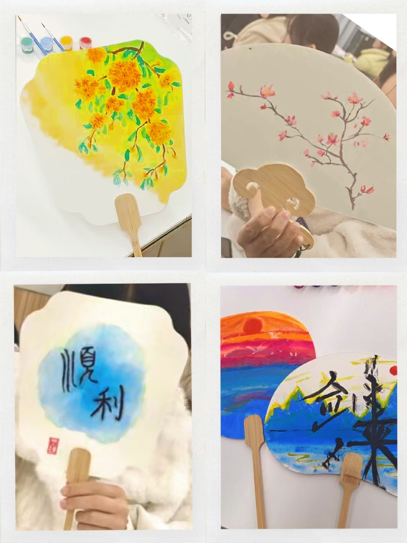 制扇的过程中,两位老师不时地予以必要的指导。同学们聚精会神,充分发挥想象,笔尖流转之间,一幅幅精妙绝伦的画在团扇的扇面上呈现出来。互动环节,同学们轮流用英语描述手中扇子的寓意。