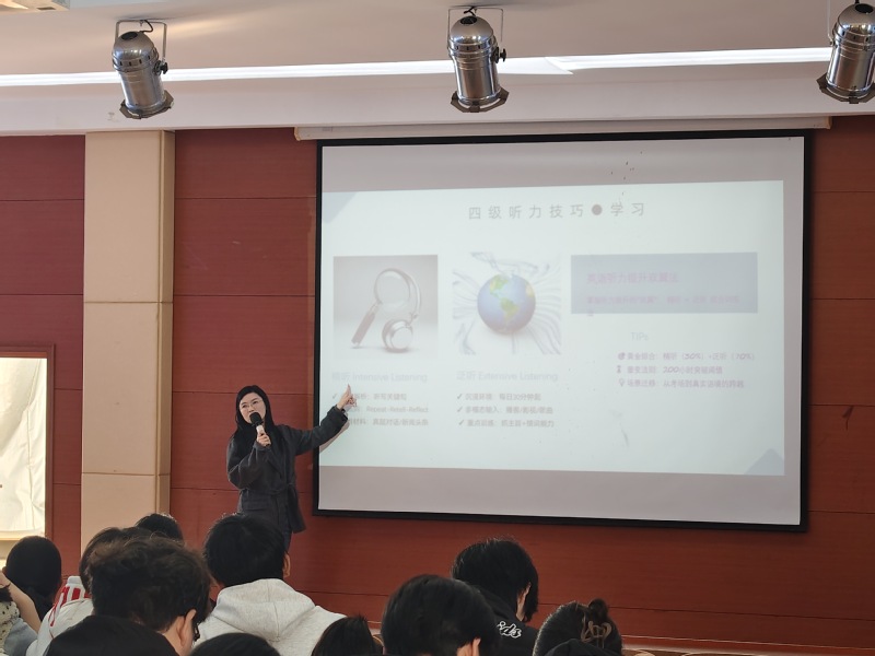 活动中,姚娜老师结合教学经验,分享四级听力备赛相关内容。她分析了听力题型特点、命题规律及考点,讲解了听力素材积累、答题技巧和心态调整等方面的方法,强调日常泛听与精听结合的重要性,并推荐了备考资源。针对不同听力题型,姚老师分享了关键信息抓取、答案预判等技巧,并现场为同学们答疑解惑。