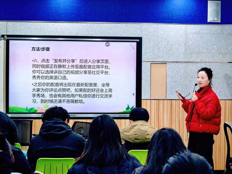 为提升学生英语口语,强化用英语讲好中国故事的能力,外国语学院于3月11日在明德301教室成功举办“经典作品英语配音技巧与实操”主题英语角活动。本次活动由陈芳芳老师与王晴老师共同主讲,采用“理论精讲+实操演练”相结合的方式,围绕配音选材、语音规则、情感表达等核心要素,与学生展开深入互动与探讨。