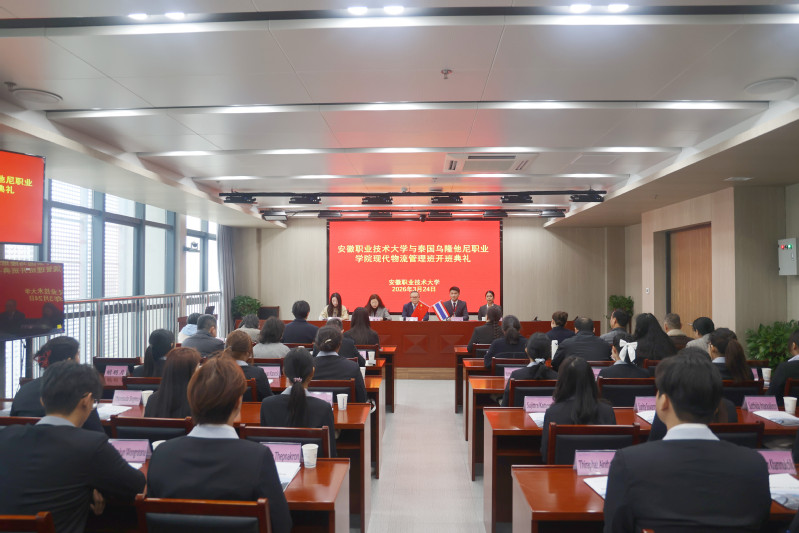 本网讯(外国语学院 现代商务学院)3月24日下午,安徽职业技术大学行知学院-泰国分校第四届留学生开班典礼圆满举行,泰国乌隆他尼职业学院副院长威拉差·索姆贾和合作处处长阿皮尼娅·布阿坎科特应邀出席。学校党委副书记、校长盛鹏,相关职能部门、二级学院负责人,教师代表及20名物流管理专业泰国留学生共同参加典礼。