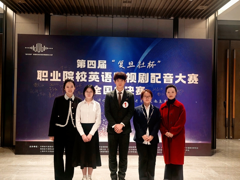 本网讯(外国语学院)近日,第四届“复旦社杯”职业院校英语影视剧配音大赛全国总决赛在青岛圆满落幕。安徽职业技术大学外国语学院教师王晴、陈芳芳带领学生团队——徐颖、王艺桐(均为数字媒体技术专业)及陶帅(铁道工程技术专业),凭借出色发挥,荣获全国二等奖。