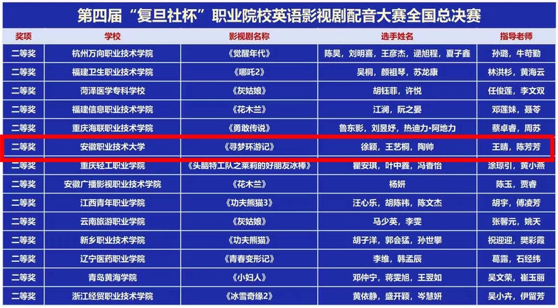 此次获奖,既是安徽职业技术大学外语教学成果的集中体现,也彰显了我校学生在英语应用能力和艺术表现力方面的巨大潜力。外国语学院将继续以赛促学、以赛促教,推动学生在真实语境中提升英语综合运用能力,培养更多具备国际视野与表达能力的高素质技术技能人才。(文/王晴 图/陈芳芳 王晴 初审:冷慧勤 预审:胡菁蕾 审核:何晓皖)