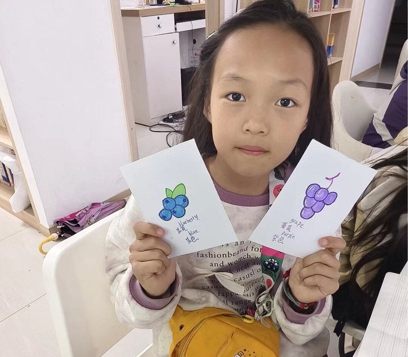 活动伊始,志愿者通过色彩鲜艳的水果图片,以中英文对照的方式带领孩子们朗读“apple”“banana”“orange”等基础水果单词。短短十分钟内,孩子们已能自信跟读并拼出大部分单词。随后进入“你画我猜”环节。孩子们发挥想象力:有孩子画了一个红彤彤的圆球和一片绿叶,同伴迅速写出“apple”;有孩子画了一弯黄色月牙和棕色小点,被猜出是“banana”。一位小朋友画了一串紫色小圆球,顶部带绿色小梗,大家异口同声说出“grape”。志愿者老师们穿梭在座位间,及时纠正拼写错误——例如有孩子写“strawberry”时漏掉字母“r”,老师便耐心提醒其检查,并带领全班齐声朗读。
