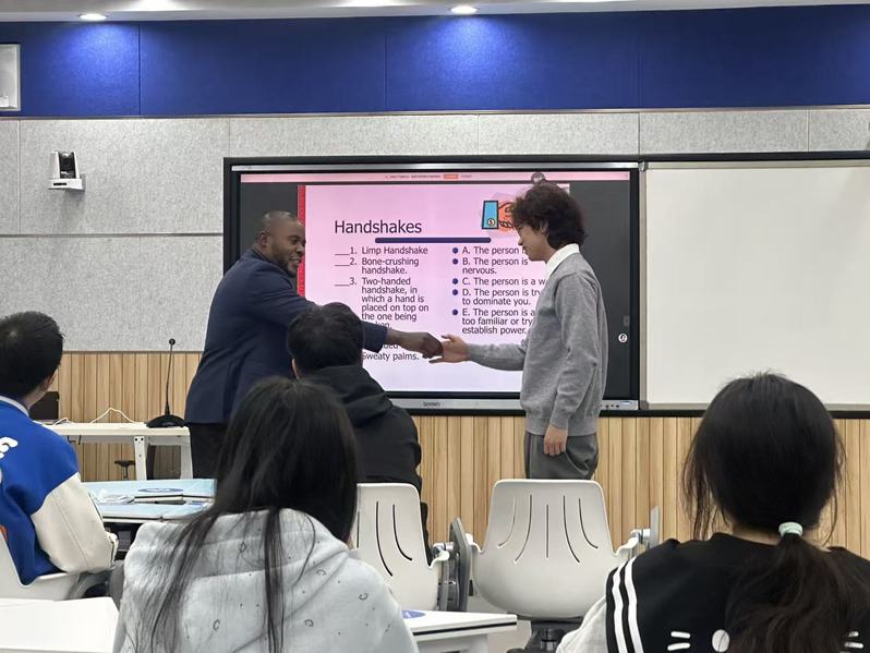 外教Awonfor Churchill以全球商务文化差异为切入点,具体阐释了商务场合中问候礼仪与握手礼仪的核心准则,通过跨文化案例对比,具体讲解了不同地域商务礼仪规范,着重强调了礼仪细节在建立专业信任感和推动商务合作中的关键作用。