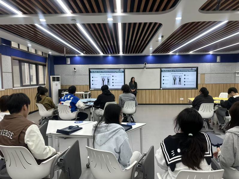 李婧老师向同学们介绍了商务用餐的基本礼仪,强调了礼仪背后所体现的尊重与文化内涵,并通过对比中西方餐桌礼仪差异,引发大家对跨文化交际的思考。