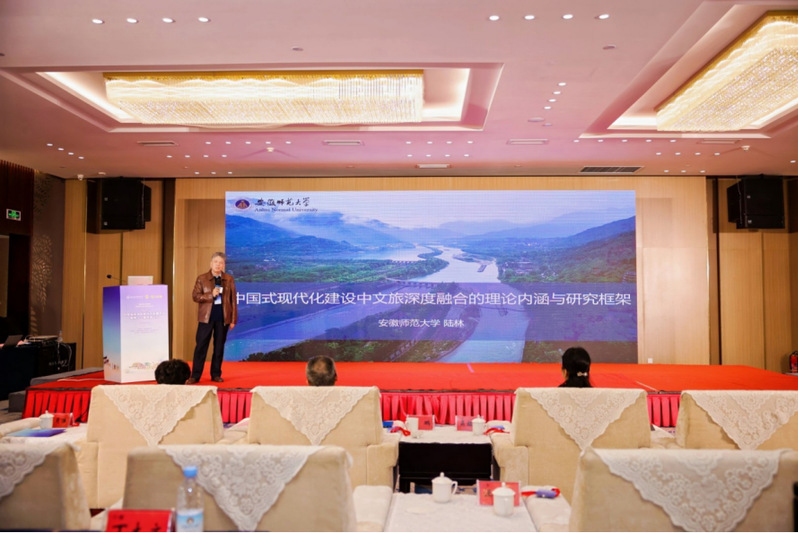 省文化和旅游厅党组成员蔡小莉,安徽职业技术大学行政负责人盛鹏,安徽省教育厅职成教处处长饶庆眉,省文化和旅游厅科技教育处处长许才文,安徽省文化与旅游厅原二级巡视员、安徽省旅游协会会长汪顶胜,省旅游学会顾问、原安徽省旅游局一级巡视员张雪平,合肥市文化和旅游局局长吴娅娟,省旅游学会会长徐华玉,安徽云驴通信息技术有限公司董事长阮成友等领导,与近50 所高校的 120 余名专家学者及文旅业界代表齐聚一堂,围绕 “创新驱动、协同发展 —— 赋能安徽文旅产教融合新生态”主题共话发展。开幕式校领导胡辉平主持。