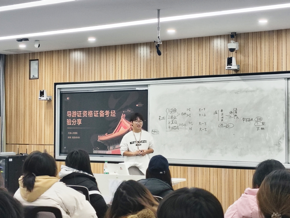 随着导游资格考试的日益临近,为帮助备考同学做好最后的冲刺规划,11月19日晚,一场及时而高效的“导游证备考冲刺分享会”在101智慧教室成功举办,吸引了七十余名同学踊跃参与。