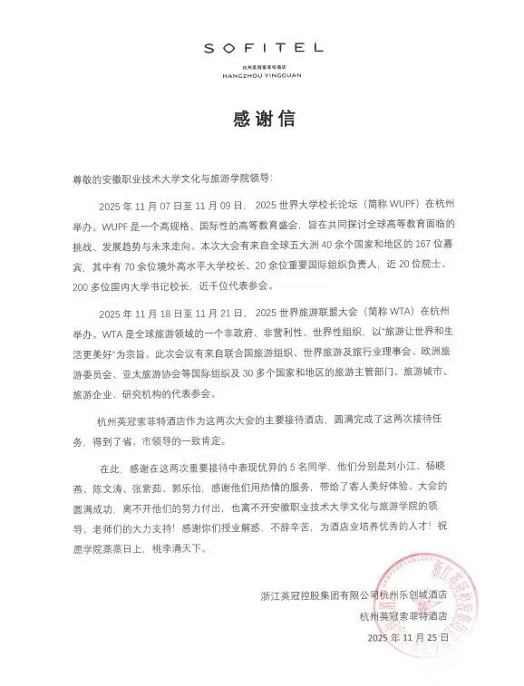 近日,我院收到杭州英冠索菲特酒店的感谢信,对旅游管理专业5位学生在服务“2025世界大学校长论坛”和“2025世界旅游联盟大会”期间的出色表现给予高度肯定。这既是对学子专业素养的褒奖,也是对我院深化产教融合、推进校企合作育人成效的有力印证。