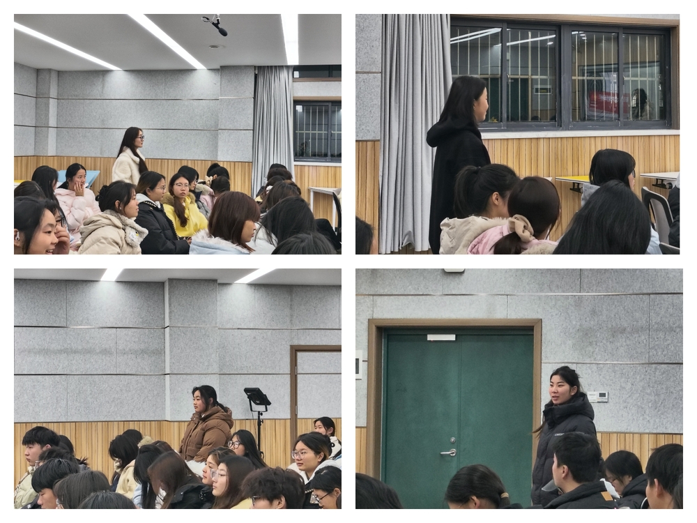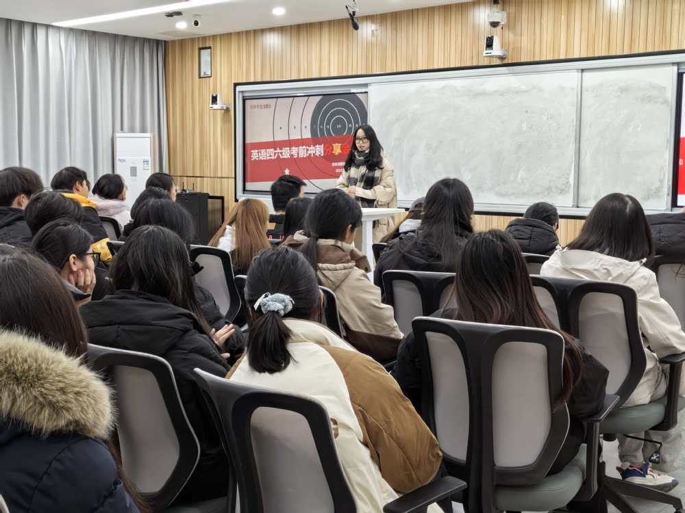 殷如婷同学结合自身备考经历与实战心得,围绕四六级考试的题型特点、冲刺阶段的时间规划、高频考点分析与解题技巧等方面,进行了系统而细致的分享。她重点讲解了听力速记方法、阅读信息定位、写作框架构建以及翻译关键要点,并提供了具体的复习资料推荐与临场应试策略。在互动环节,同学们踊跃提问,就备考中遇到的难点与困惑与主讲人进行了深入交流,殷如婷一一给予了耐心解答与个性化建议。