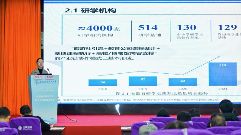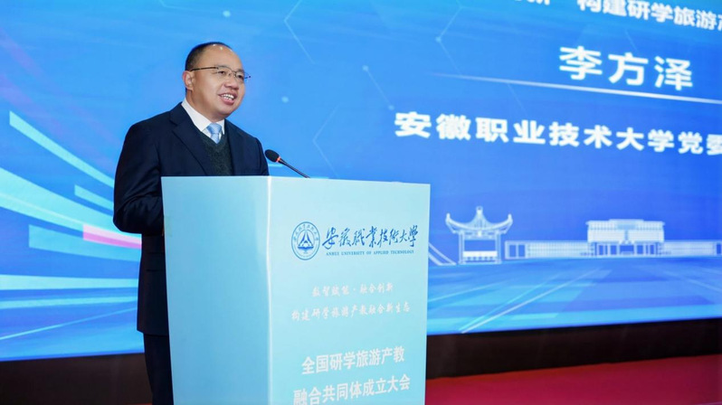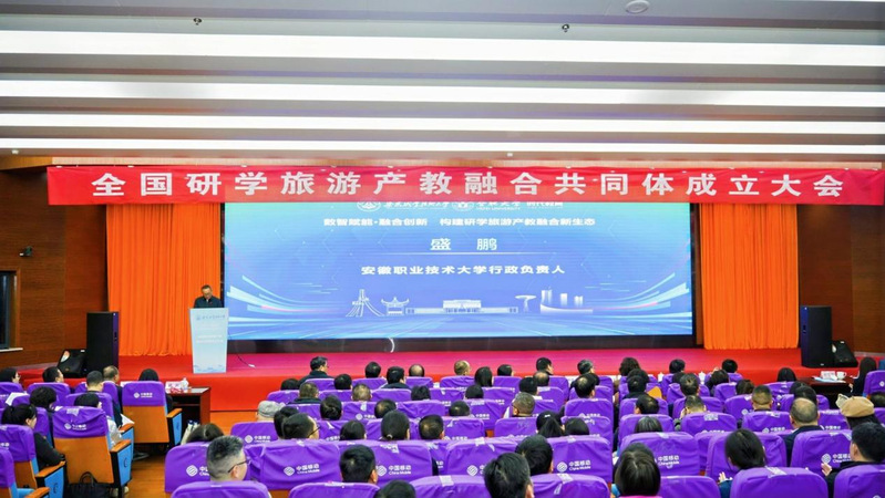 12月6日,以 “数智赋能・融合创新 —— 构建研学旅游产教融合新生态” 为主题的全国研学旅游产教融合共同体成立大会在安徽职业技术大学顺利召开。安徽省教育厅一级巡视员张昌华,安徽省教育厅职成处处长饶庆眉、安徽文化和旅游厅科教处处长许才文,北京大学原副校长、北大信息技术高等研究院首席经济学家张国有,合肥大学党委副书记周飞等兄弟院校领导,合作企业代表,学校党政领导班子成员及师生代表近400余人,共同见证这场研学旅游产教融合盛会。
