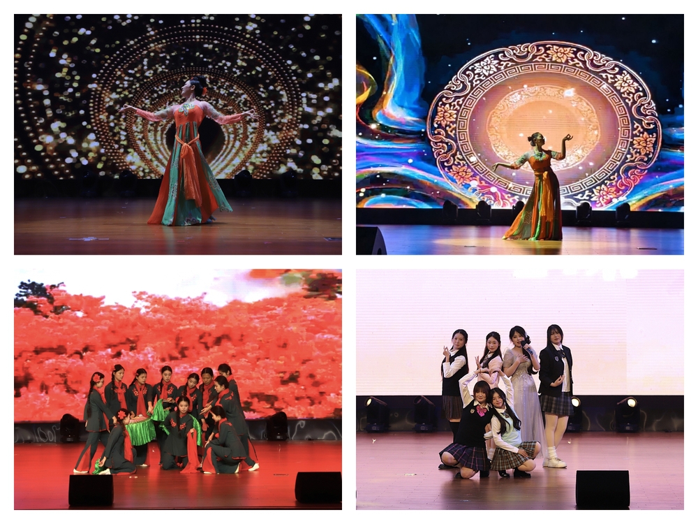 表彰环节与文艺表演穿插进行,相得益彰。舞台上,系列舞蹈节目彰显了文化传承与时代脉搏的共振。经典民族舞《映山红》以深情婉转的肢体语言,诉说着历久弥新的情怀;而一系列现代舞蹈串烧《What is love》《Thirsty》《有你在》则瞬间点燃全场,以动感的节奏与奔放的活力,展现着当代青年的时尚风貌。尤为精彩的是,刘心洁老师带来的古典舞《唐印》翩然登场,一姿一态、一颦一笑间尽显大唐风仪,完成了一场跨越千年的艺术对话。三者同台,恰恰构成了从传统精神到现代表达、从民族情韵到国际潮流的生动叙事,体现了文旅师生深厚的文化底蕴与开放创新的艺术视野。