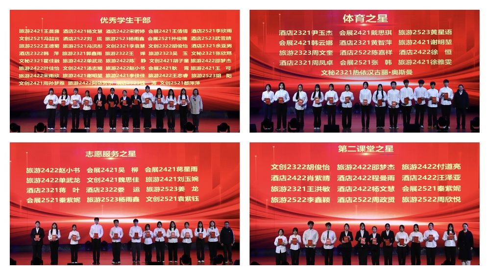 大会对2025年度涌现出的“优秀学生干部”、“体育之星”、“志愿服务之星”、“第二课堂之星”等各类先进个人进行隆重表彰。正如暖场歌曲《有我》所唱“承风骨亦有锋芒,有梦则刚”,这些在不同领域发光发热的学子,正是这份“有我”担当的最好诠释。他们以服务彰显奉献,以拼搏定义青春,以爱心温暖校园,以实践拓展成长,生动展现了文旅学子多元发展的卓越风采,让“知行合一、全面发展”的育人理念在具体的榜样中熠熠生辉。每一份荣誉,都是汗水浇灌的花朵;每一个身影,都是文旅精神薪火相传的生动注脚。