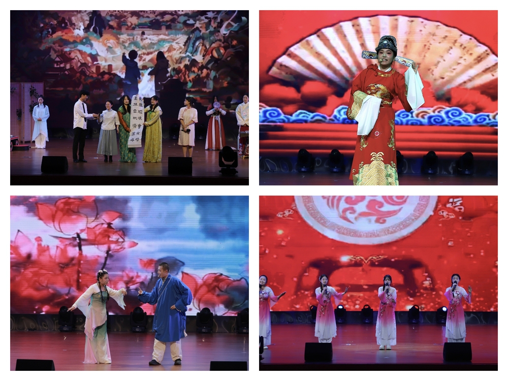 学院师生同台共创,以舞台为卷,生动绘就中华文化之美。师生携手创意编排的《诗画中国》,融诗词雅韵、传统仪范与视觉艺术于一体,营造出意蕴绵长的高雅意境;由吴晓曼老师指导、学子演绎的黄梅戏串烧《徽风皖韵》,唱腔婉转醇正,表演韵味悠长,让徽风皖韵在光影之间流转生香,彰显戏曲艺术穿越时代的生命力。