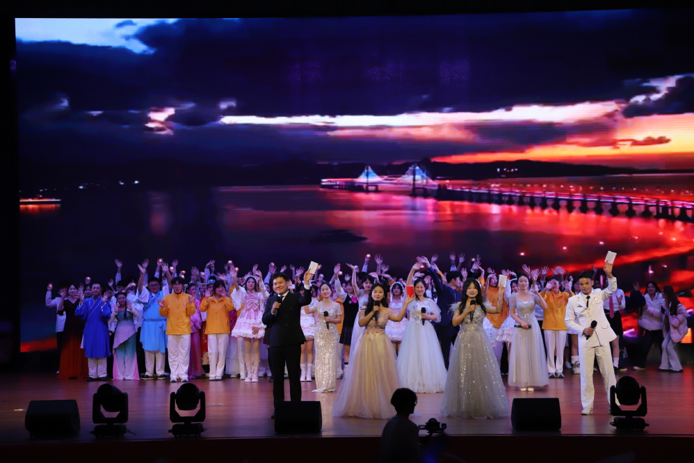 晚会在动人的合唱中达到情感高潮。旅游2521班全体同学带来的《紫荆花盛开》,歌声清澈,情感真挚,表达了深沉的爱与向往;最终,全场师生齐声高唱《相亲相爱》,并点亮手机闪光灯,汇成一片温暖星海,寓意文旅大家庭同心同德、携手未来的美好愿景。