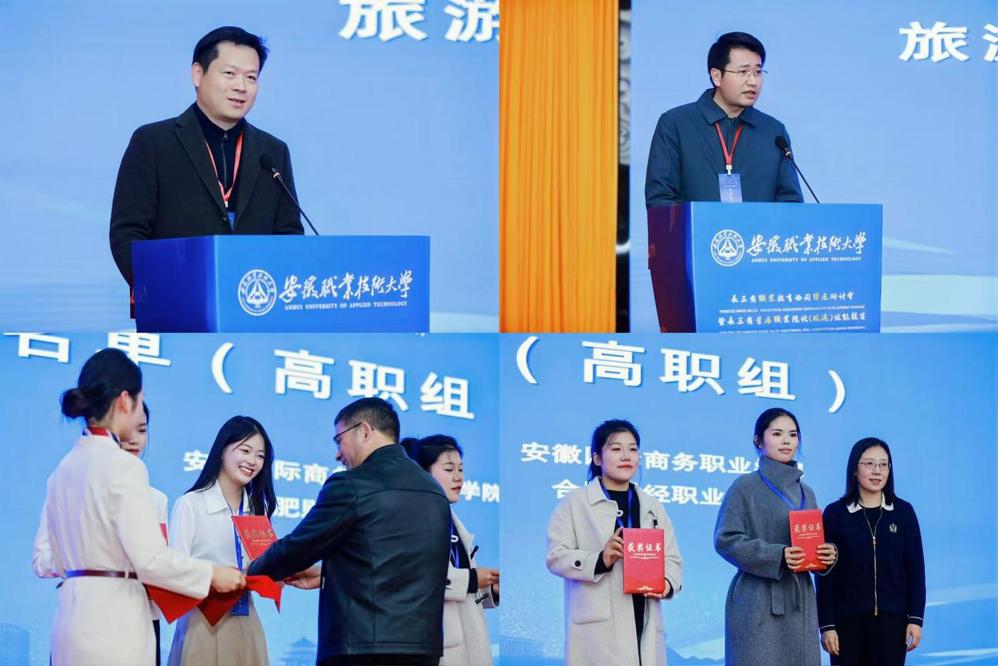 经过一天的激烈角逐,各参赛队伍凭借出色表现交出了满意答卷。下午16时,闭幕式在图文信息中心三楼报告厅举行,山东旅游职业技术学院副校长魏凯、安徽职业技术大学校领导胡辉平出席闭幕式,文化与旅游学院院长童登峰主持。裁判代表常州旅游职业技术学校史剑锋教授、河源职业技术学院张颖教授分别对对本次赛事中、高职组的赛况进行专业点评,充分肯定了参赛作品的高质量与选手们的专业素养,并提出了针对性的改进建议。随后,现场公布比赛成绩并举行颁奖仪式,获奖队伍依次登台领奖。我校在此次大赛中斩获了高职组一等奖、二等奖,中职组三等奖的好成绩。