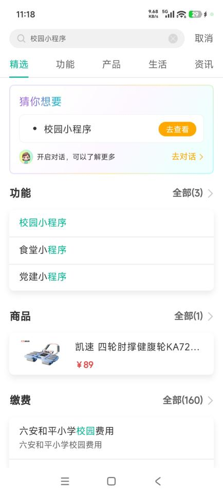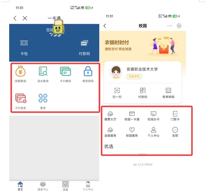 (2)在农行APP顶部搜索“校园小程序”,选择“安徽职业技术大学”并根据提示绑定刚和人信息。