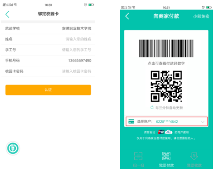 (2)进入“支付宝校园卡”,绑定身份信息,学校选择“安徽职业技术大学”。