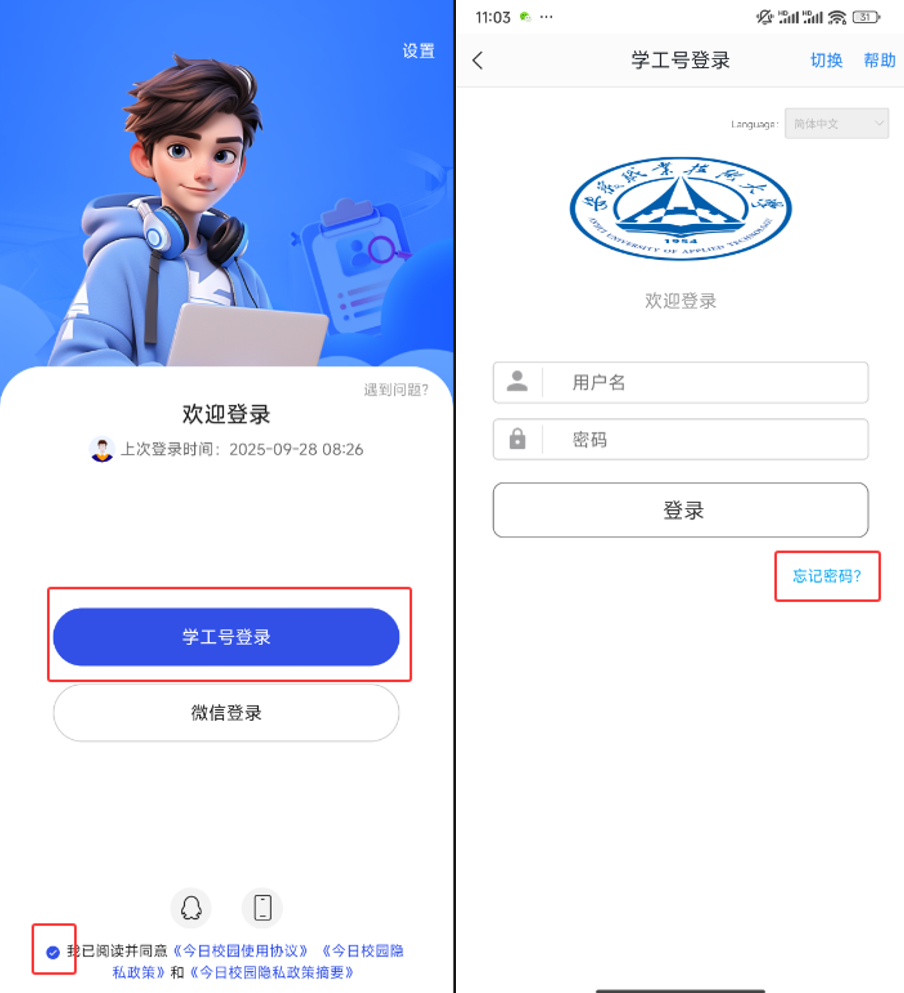 打开今日校园,选择【学工号登陆】,然后选择【忘记密码】。