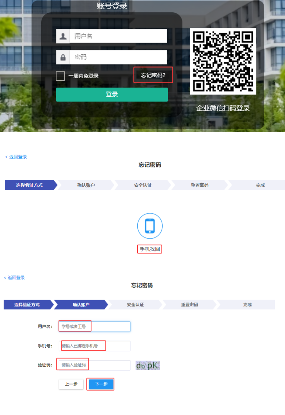 登陆智慧校园时,在统一身份认证界面,点击【忘记密码】,按照步骤操作。