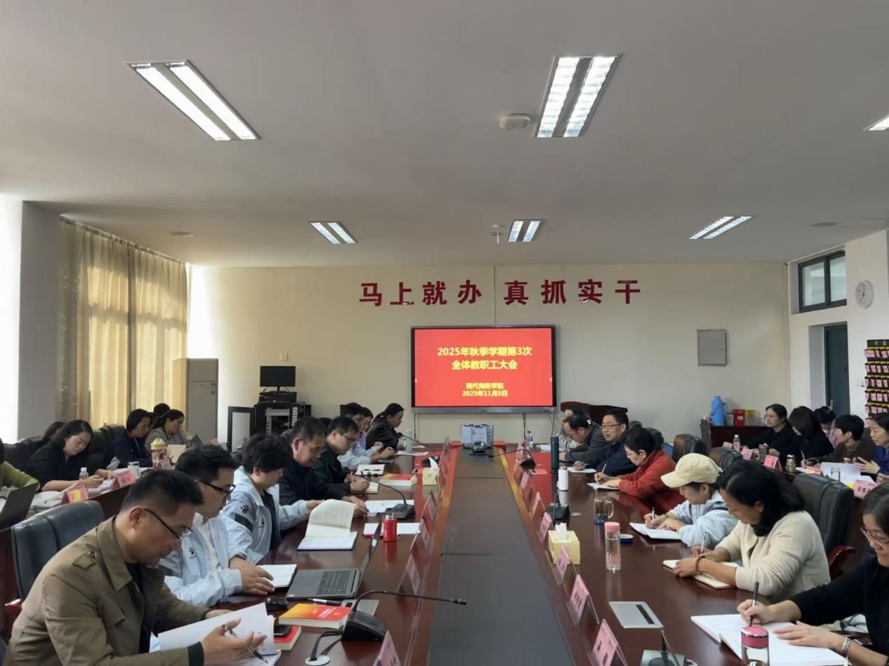 2025年11月5日中午,现代商务学院在至勤楼305会议室召开2025年秋季学期第3次全体教职工大会。学院党政负责人及全体教职工参加会议,会议由学院党总支负责人程基鹏主持。