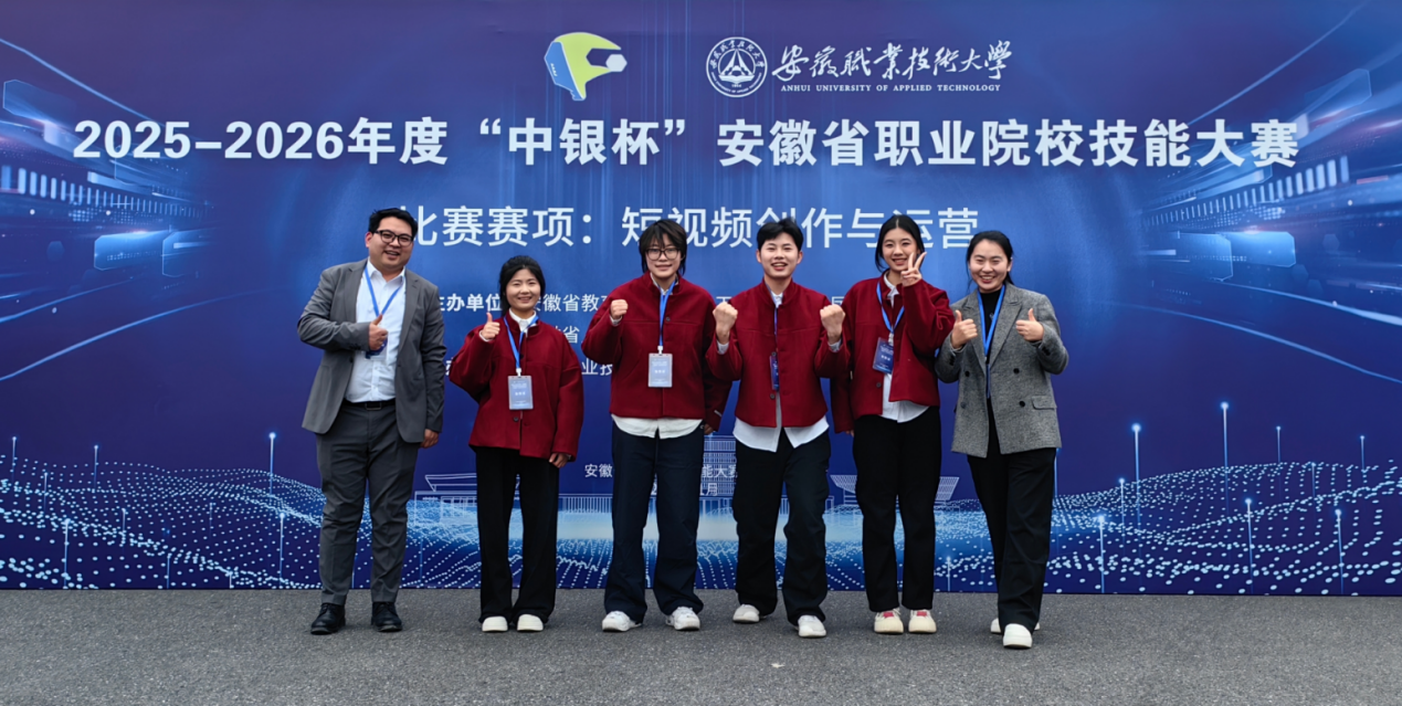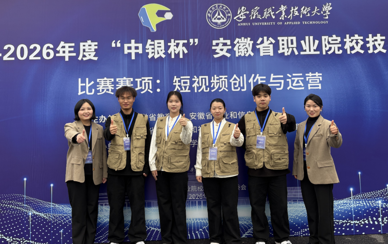 2026年1月30日至2月1日,由现代商务学院雷纶源、徐倩、朱丽丽、聂梦真等四位教师组成的指导团队,带领学生一队张可、肖雨婷、王子琪、陈思颖以及二队刘淼、汤文俊、吴英男、张晋瑄,在合肥参加2025年安徽省职业院校技能大赛(高职组)“短视频创作与运营”赛项,该赛项由安徽职业技术大学承办。