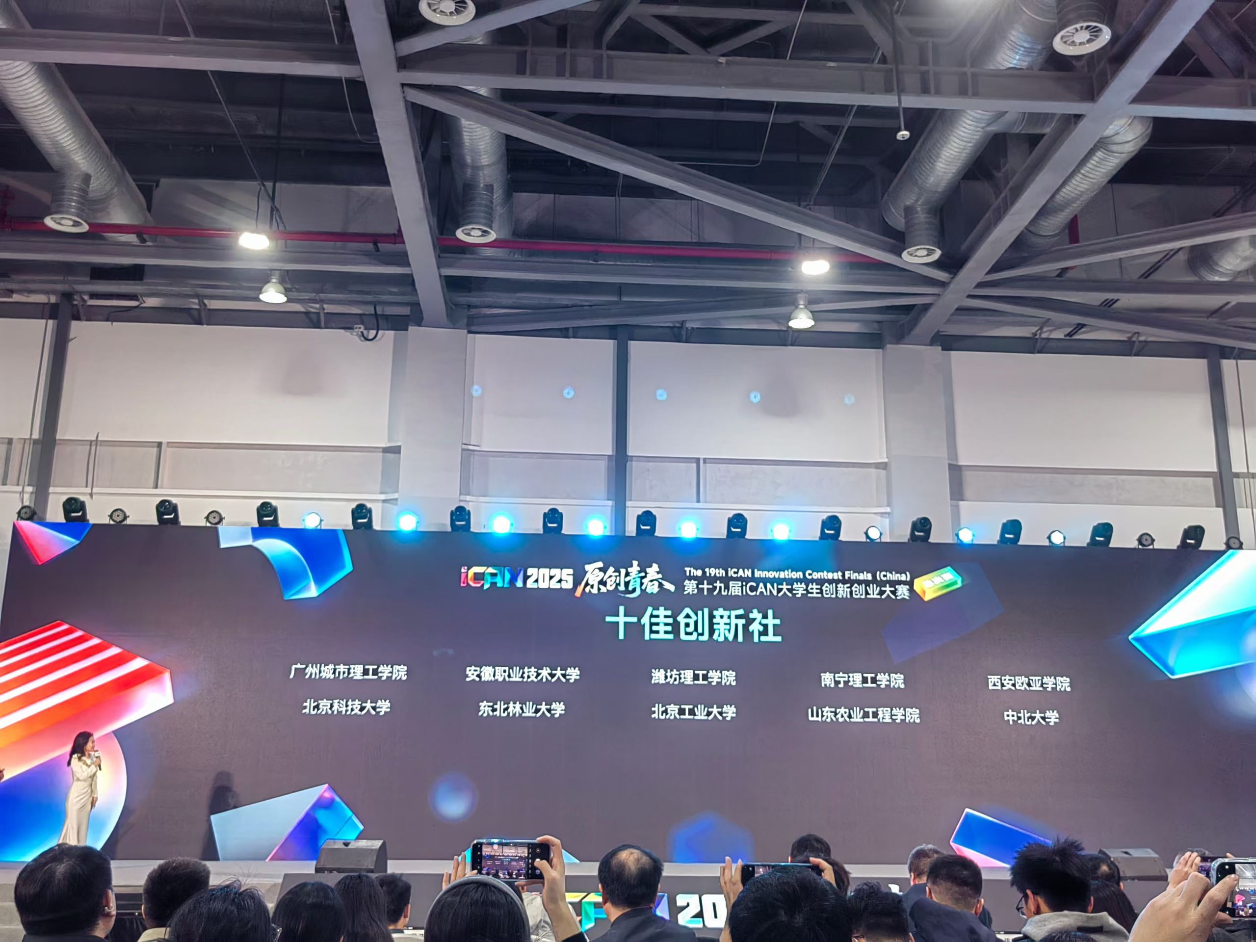 11月30日,第十九届iCAN大学生创新创业大赛全国总决赛在杭州国际博览中心顺利闭幕。我校iCANLab创新团队凭借出色的育人成果,与北京科技大学、东北林业大学、北京工业大学等211”双一流“高校团队一同获评2025年度iCANLab全国“十佳创新社”。