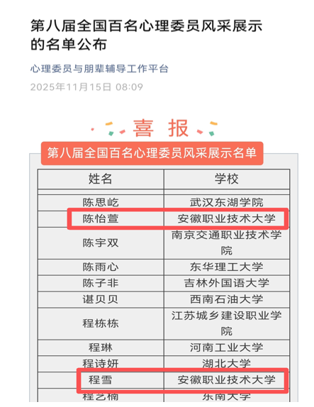 我校两名心理委员的成功入选,不仅是对其个人工作能力的充分肯定,也是我校长期重视朋辈心理育人工作、深化“学校—院系—班级—宿舍”四级心理健康教育工作体系建设成效的集中体现。学生处大学生心理健康教育中心将继续加强朋辈队伍的培养与赋能,充分发挥其在普及心理健康知识、提供朋辈支持、构建和谐校园中的骨干作用,共同营造关注心理健康、守望成长、充满温情的校园氛围。(图文/王丽平)