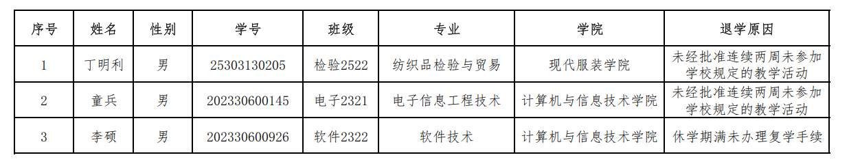 根据《普通高等学校学生管理规定》(教育部令第41号)第三十条:(二)休学、保留学籍期满,在学校规定期限内未提出复学申请或者申请复学经复查不合格的;(四)未经批准连续两周未参加学校规定的教学活动的;学校可予退学处理;以及《安徽职业技术大学学籍学历管理办法》第十九条相关规定,拟对符合退学情形的3名学生给予退学处理,现予以公示。