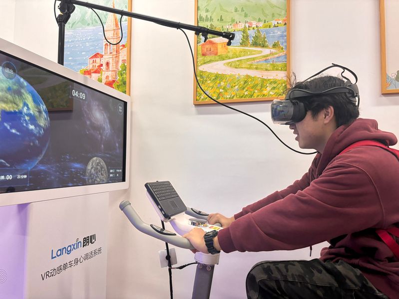 在中心志愿者的带领下,同学们依次参观了接待区、个体心理咨询室、团体活动室、放松室、宣泄室及沙盘游戏室等功能区域,详细了解中心提供的个体咨询、团体辅导、心理测评、危机干预等服务,并亲身体验了智能心理服务设备。在动感单车体验区,同学们通过运动及实时身心数据反馈,切身感受运动对情绪调节的积极效果;在AI心理对话小屋,大家与智能助手进行模拟对话,亲身体验人工智能在心理倾诉与初步疏导中的应用。这些科技元素的融入,体现了心理中心在心理健康服务手段上的持续创新。