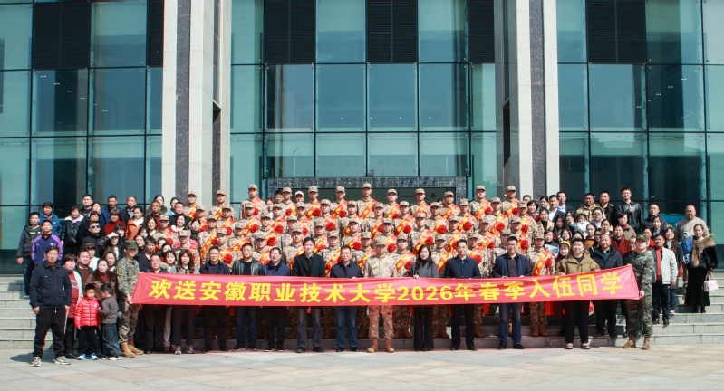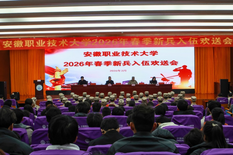 为深入贯彻落实征兵工作部署,鼓励青年学子投身国防事业,3月14日,安徽职业技术大学2026年春季新兵入伍欢送会在图文信息中心学术报告厅举行。合肥市瑶海区武装部上校部长李建国应邀出席。校领导宣岩松,就业与创新创业指导中心主任王乌兰,各二级学院党总支负责人,以及全体入伍新兵、新兵辅导员和家长代表参加会议。欢送会由学生处处长左菁华主持。
