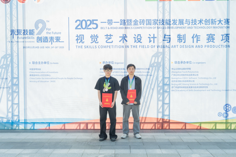 11月14-16日,2025“一带一路”暨金砖国家技能发展与技术创新大赛视觉艺术设计与制作赛项全国总决赛在广州中山举行。艺术与创意学院视觉传达设计专业杨承、陶翰文两位同学,从全国151支参赛队伍中脱颖而出,双双斩获国赛三等奖。