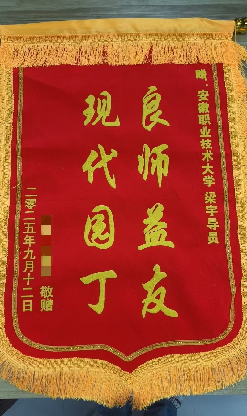 近日,艺术与创意学院视觉传达设计2421班何同学将一面写有“良师益友 现代园丁”的锦旗,郑重交至辅导员梁宇老师手中,感谢其在突发危急时刻给予的及时救助和入校以来的持续关怀。